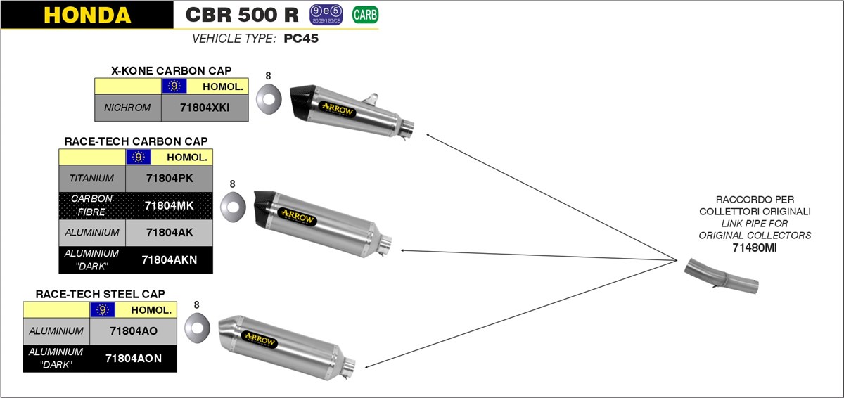Arrow Race-Tech Aluminium Slip-on Einddemper met E-keur incl. Linkpipe 71480MI Honda CBR 500 R 2013 > 2018